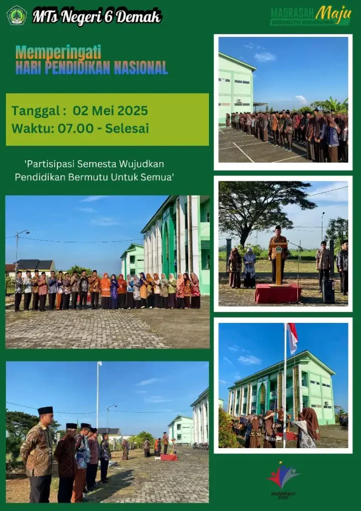 Demak, 2 Mei 2025 — Dalam rangka memperingati Hari Pendidikan Nasional (Hardiknas) Tahun 2025, Madrasah Tsanawiyah Negeri 6 Demak melaksanakan upacara bendera secara khidmat di halaman madrasah pada Jumat pagi, 2 Mei 2025. Kegiatan ini diikuti oleh seluruh siswa, dewan guru, tenaga kependidikan, dan staf madrasah.